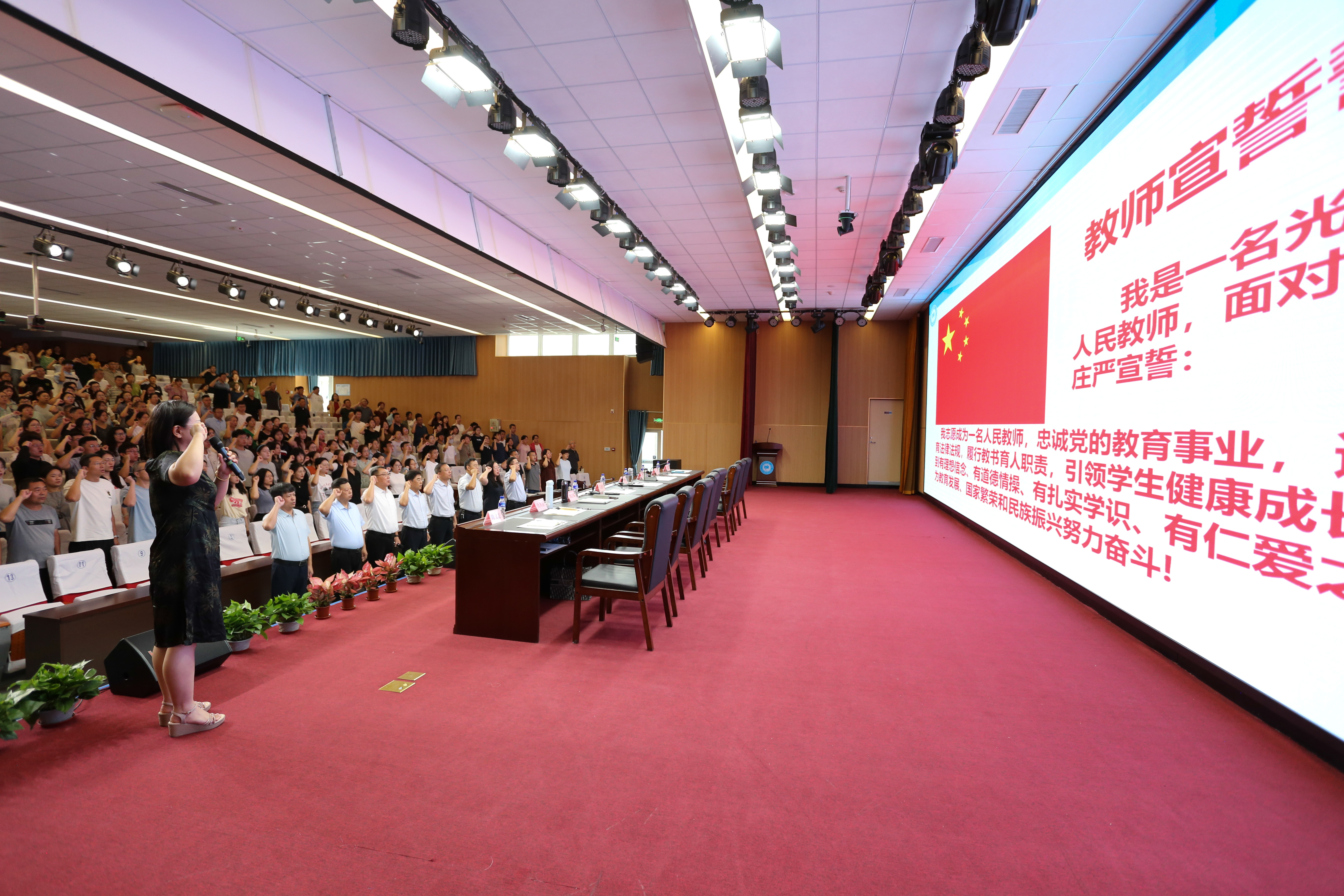 庄重严肃的奏唱国歌仪式后,全体教职工进行新学年宣誓。教务处副主任邢莉领誓。大家面向国旗,举起右拳,许下坚守教育使命、恪尽职业操守的庄严承诺。