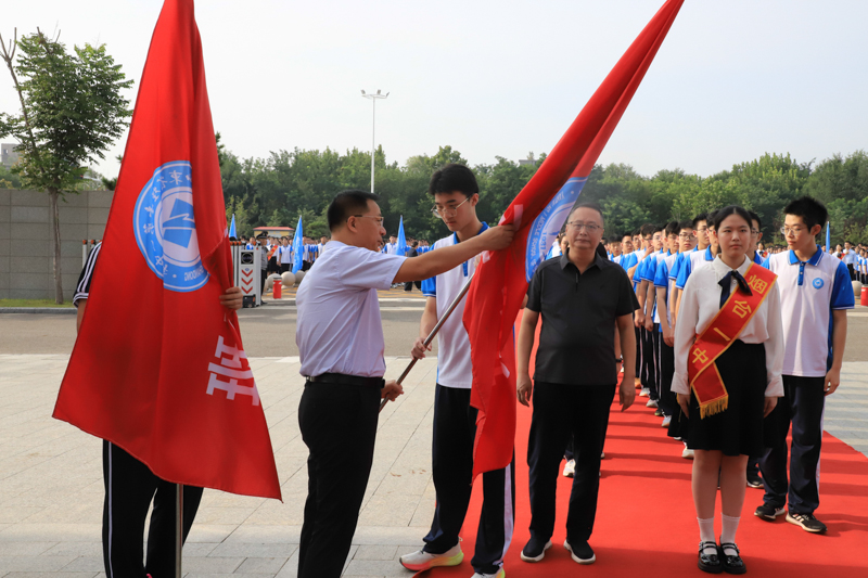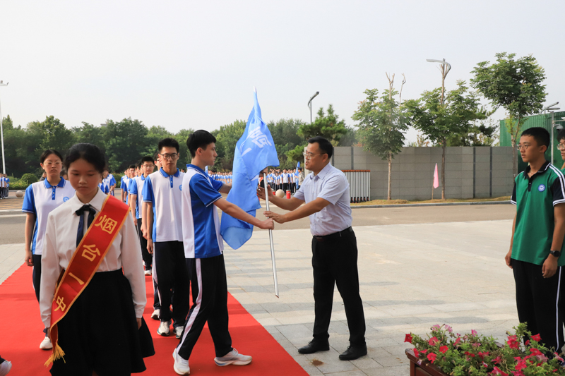 活动现场,各班学生代表依次走过“一中门”,将高二年级旗帜交至副校长刘志强手中。幸福校区执行校长马述涛授予高三年级旗帜。旗帜的交接,不仅象征着身份的转变,更代表着责任的传承与精神的延续。同学们步伐坚定、目光如炬,展现出迈向高三、迎接挑战的昂扬姿态。